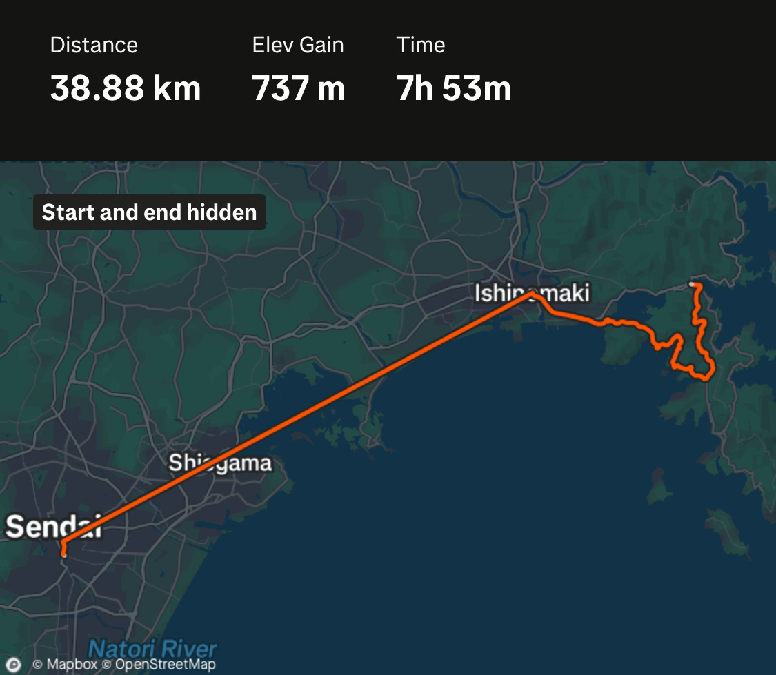 I took the train back to Ishinomaki and started heading north on paved roads. “Hiking trail” feels like the wrong description for whatever this is.