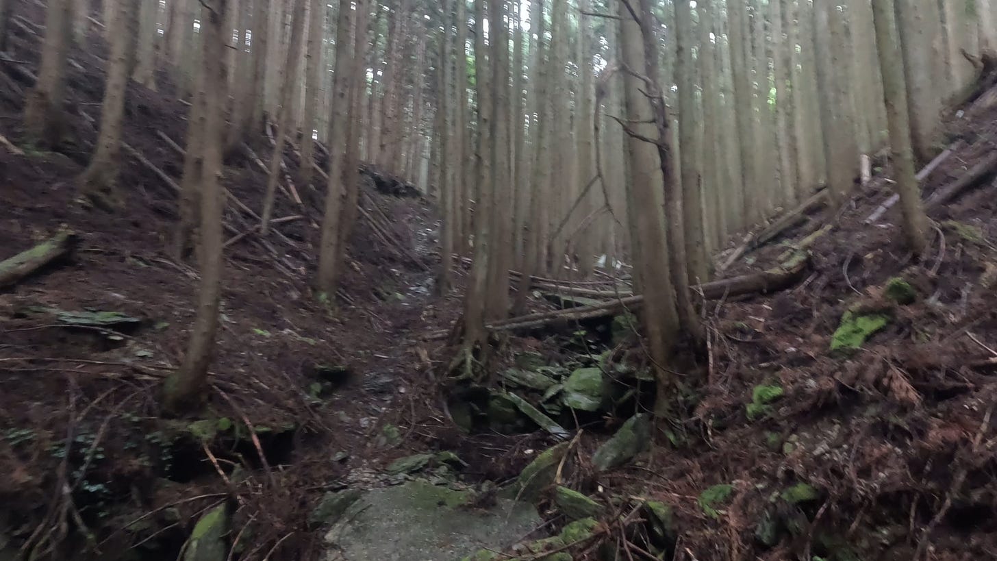 even though the trails of the Himalayas and Japanese Alps were steep and trying, I decide I prefer them to these overgrown bug and leech-filled rolling hills
