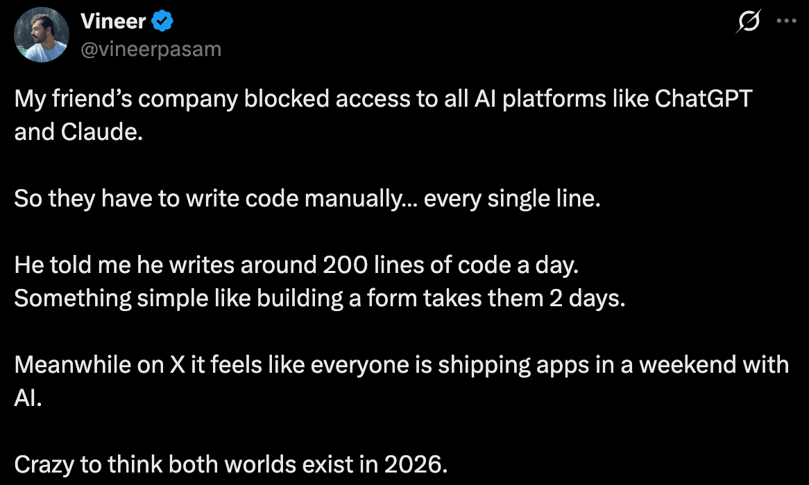 Some of the world’s greatest software engineers are the ones who hate AI the most. They say, “I write much better code than AI.” They are correct, but who cares? What happens to the best engineer on a team? They get promoted, and then they have to manage engineers who write worse code than them. The idea is not that AI will do something better or worse but to take a step back, stop meddling in the details, and define an end goal well so AI can hit it.